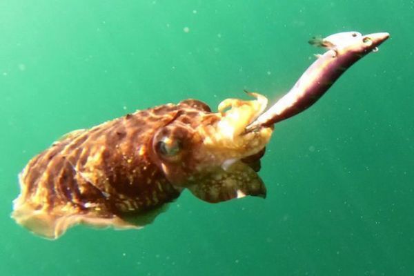Seine Jagdmethode ist furchterregend: Tintenstrahlen, um die Beute zu blenden, Greifen mit den beiden langen Tentakeln, Injektion eines Giftes und dann Zerreißen durch seine hornigen Kiefer. Scharfe Schnitte in einem Softbait oder Lebendköder signalisieren die Anwesenheit von Tintenfischen!