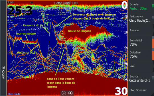 Unterhalb dieser Kugel zeugen zahlreiche Echos in Form von länglichen Bögen von starker Aktivität. Es handelt sich um Gelbflossenthunfische, die fressen. Da ich den Köder auf dem Bildschirm gut sehen kann, platziere ich ihn direkt unter der Kugel und sichtbar für die Räuber, um einen erfolgreichen Angriff auszulösen.