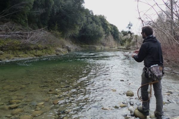 Der Angler, der dem Fisch gegenübersteht, muss sich diskret nähern, da er sonst Gefahr läuft, die Forellen mit der Nase in der Strömung zu verscheuchen und abzurutschen. Die Würfe können weniger präzise sein als stromaufwärts, man muss nur die Einholung beschleunigen oder verlangsamen und mit der Drift des Köders spielen, um den Köder dorthin zu bringen, wo man ihn haben möchte.