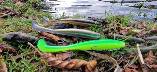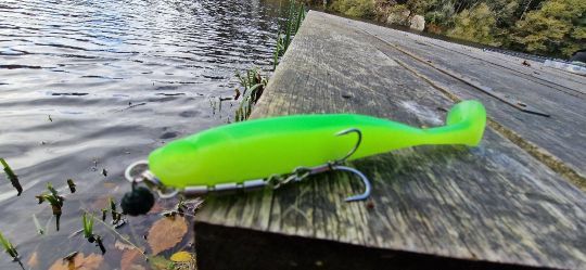- Zunächst einmal gibt es ihn mit einem Shallow Rig, also ohne Blei, dafür aber mit einem bauchigen Drilling, der sich beim Anschlag löst. Diese Montage ist sehr interessant für Hechte, aber auch für Barsche, über Austernparks oder in flachen Gewässern. Natürlich kann man auch ein Granatenblei am Kopf anbringen, um etwas tiefer zu angeln.