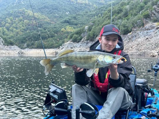 Man kann ihn vom Kajak aus mit Weichködern wie Shad oder Finesse von 10 bis 18 cm an einem Bleikopf angeln, wobei man linear entlang der Kanten und Bruchstellen fischt. Auch mit Schwimmfischen (Jerkbait, Cranbait) lassen sich gute Ergebnisse erzielen, wenn man die Stabilität des Kajaks bei härteren Würfen kontrolliert.