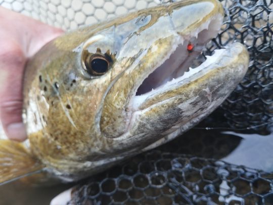 Der erste Wurf ist ziemlich gut. Ich beobachte meine Drift, aber es passiert nichts. Ich warte ein wenig und lege meine Nymphe für den zweiten Durchgang etwas weiter flussaufwärts ab. In dem Moment, in dem meine Nymphe über die Masse kommt, sehe ich, wie diese nach oben steigt - das ist definitiv eine Forelle! Ich kann den Fang der Nymphe nicht sehen und fische ein wenig nach Gefühl. Meine Rute biegt sich und ich sehe, wie die Forelle sich weit verrenkt, wie es große Fische tun. Ich bin in diesem Moment sehr froh, dass ich eine lange, brandneue 16/100er Spitze habe. Zum Glück ist der Bereich ziemlich frei und nach einem schönen Kampf landet die Forelle im Kescher. Und was für eine großartige Forelle!