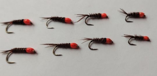 Da ich schlecht sehen kann, ist die Idee, die Nymphe nicht zu nah am Fisch vorbeizuführen, damit ich den Abstand deutlich sehen kann. Mein orangefarbener Pheasant Tail Head in 14, beschwert mit 5 Windungen, wäre perfekt. Ich habe keinen allzu großen Druck, da ich nicht davon überzeugt bin, dass ich wirklich eine Forelle vor mir habe.