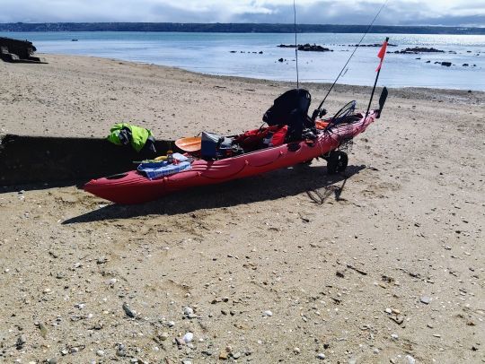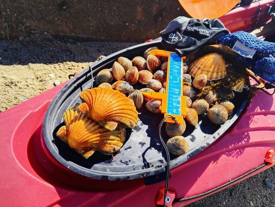 In der Zwischenzeit ist die Flut weiter gesunken, sodass ich das Kajak auf den Strand setzen kann. Vorrang haben die Prairie und die Muscheln. Da ich immer noch an meinen üblichen Stellen bin, fange ich mit den Praires an. Zur Erinnerung: Die Maschenweite für diese Muscheln beträgt 4,3 cm und die Quote liegt bei 100 Stück oder 3 kg. Ich entnehme relativ schnell etwa 50 schöne Größen und gehe dann zum Spaziergang in den Tümpeln für die Muscheln über. In diesem Jahr hatten wir nicht das Problem mit den ASP-Toxinen bei dieser Muschel. Bei uns beträgt die Maschenweite 11 cm und die Quote 30 Exemplare beim Fußangeln und 15 beim Schnorcheln. Da das Wetter schön und nicht zu windig ist, kann man sie bei einem Spaziergang durch die Tümpel mit ein wenig Übung relativ leicht sehen.