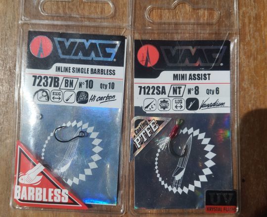 Ebenfalls von VMC habe ich Inline-Haken 7237B verwendet, mit denen ich ebenfalls sehr zufrieden war. Ich verwende Nr. 10 für die Größe 30 mm, Nr. 8 für die Größe 40 mm und Nr. 6 für die Größe 50 mm.